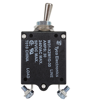 TE Connectivity / P&B W31 toggle thermal circuit breaker, 30 A. Trip-free design. Rated 50 VDC or 250 VAC (to 400 Hz).